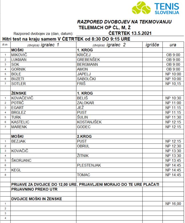 Edina igralka, ki v četrtek še ne bo stopila na igrišče v Radomljah, je 1. nosilka turnirja Hana Bečirovič Novak (ŽTKMB), ki je v 1. kolu prosta. Četrtkov spored bo namreč postregel z vsemi tekmami 1. kola med moškimi in ženskami, predstavniki močnejšega spola pa bodo v popoldanskih urah odigrali še obračune 2. kola. Na igrišče bodo tako med drugim stopili tudi vsi osmi nosilci, ki so v 1. kolu prosti.