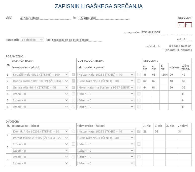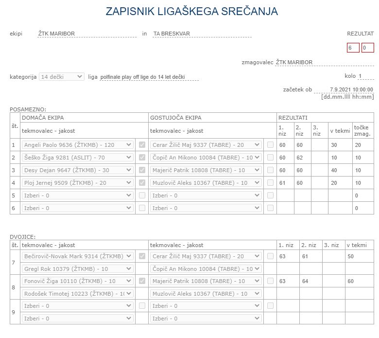 * – Zmagovalec srečanja v finalu je ŽTK Maribor zaradi večjega števila osvojenih gemov.