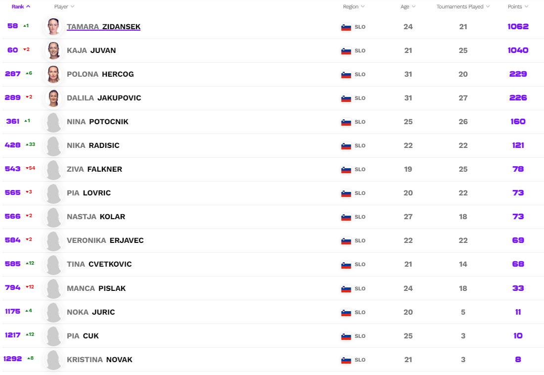 Sprememba se je zgodila tudi pri borbi za mesto najvišje uvrščene Slovenke. Tamara Zidanšek (58.) je znova za dve mesti prehitela Kajo Juvan (60.).
