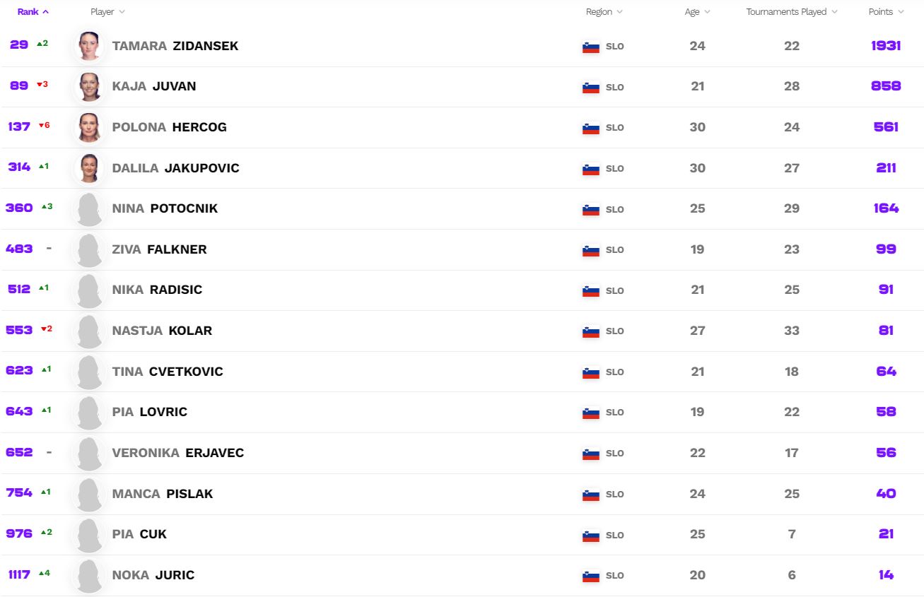Na WTA lestvici se je med elitno 30-erico prvič v karieri prebila Tamara Zidanšek, ki po novem velja za 29. igralko sveta. Od Slovenk med elitno 100-terico najdemo še Kajo Juvan, na 89. mestu, tretja najvišje uvrščena slovenska teniška igralka pa je še naprej Polona Hercog (137. na WTA lestvici).
