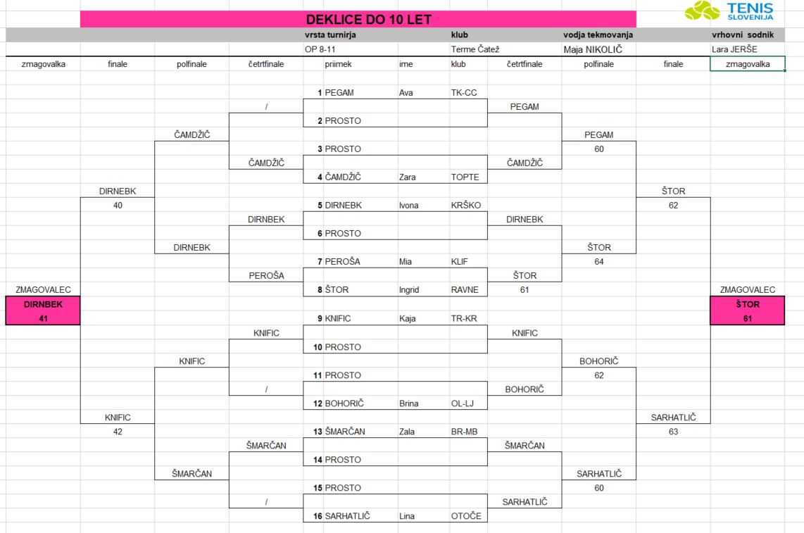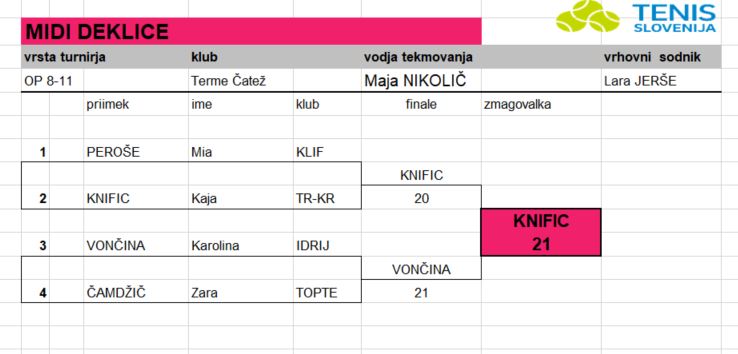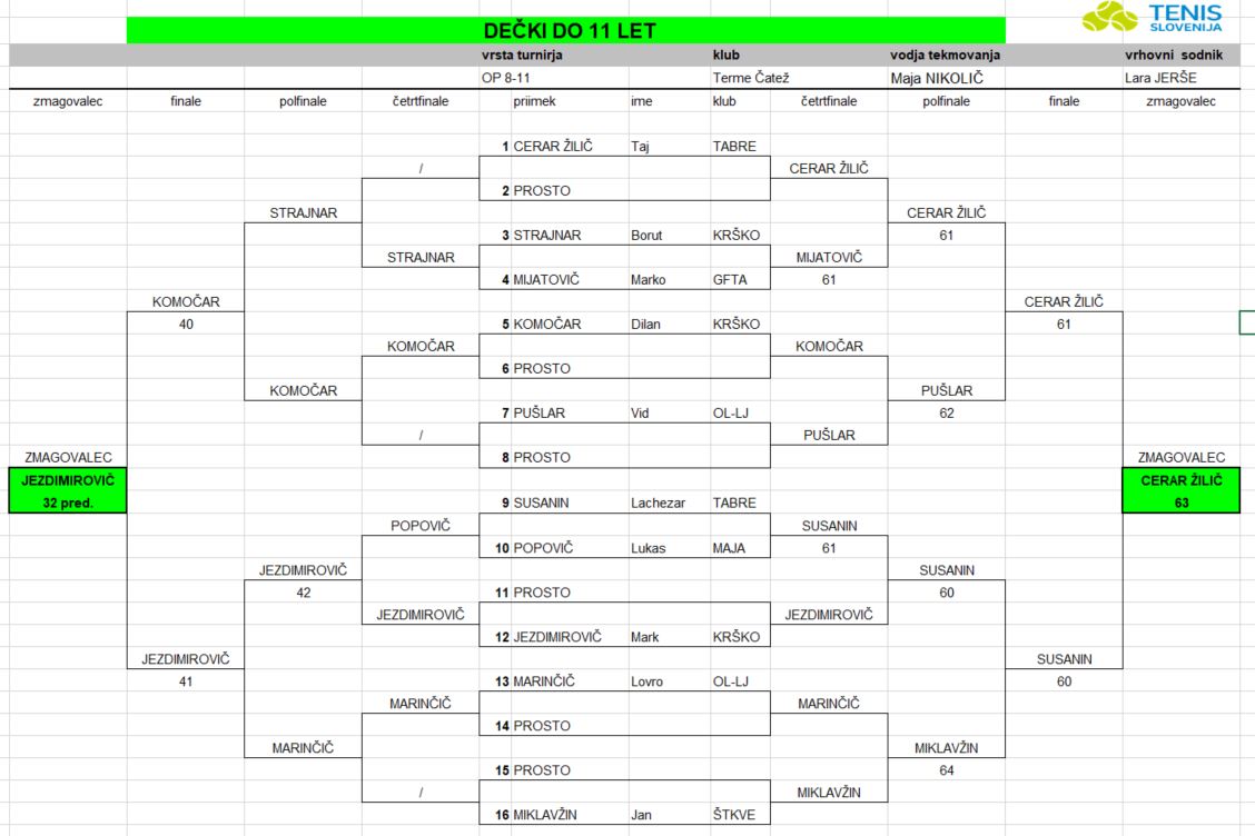 Tudi v Termah Čatež smo dobili zmagovalce osmih različnih kategorij. V glavnih dveh (dečki U11 in deklice U11) sta se turnirske zmage razveselila Taj Cerar Žilič (TABRE) in Sofija Petrič (BO-BI). Prvi je v finalu s 6:3 premagal Lachezarja Susanina (TABRE), medtem ko je bila Sofija s 6:2 boljša od Brine Bohorič (OL-LJ).