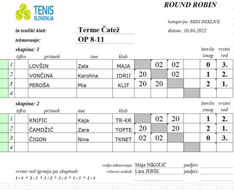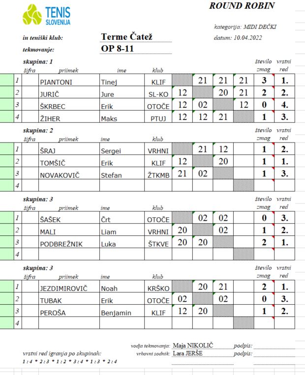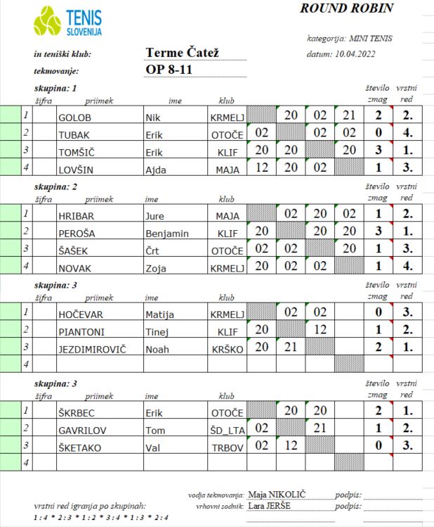 Vse ostale rezultate in zmagovalce kategorij najdete spodaj v zapisu in fotografijah. Najmlajše slovenske teniške upe bomo lahko na delu znova spremljali v mesecu maju, natančneje 21. in 22. maja, ko se bodo predstavili na turnirju v Kopru.